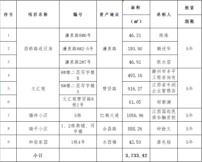2021年5月28日上午10時,在贛州市公共資源交易中心舉行的贛州振興實業(yè)有限責任公司贊賢路等二十七宗資產(chǎn)公開招租(項目編號GZCQ2021072),現(xiàn)將公開招租成交情況公示如下: